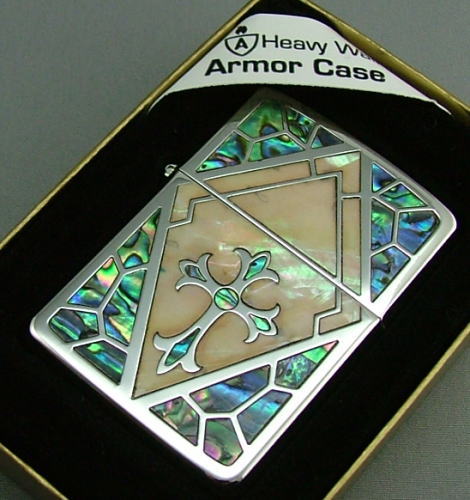 【36%OFF】ZIPPO アーマー (ARMOR CASE) ジッポー SHELL-CRS価格: 8,400円レビュー評価: 5.0 レビュー数:5 ARMOR(アーマー)ケースにハンドメイド感あふれる天然の白・黒蝶貝の象眼を施しています。角度によって輝きを変えるそのボディは弧高ともいえる存在感を持っています。ARMOR(アーマー)ケースの特徴は、、ボトムにARMORの略の[A]のマークが刻印されています。鎧を意味する言葉の通り、通常のジッポーと比べZIPPOの厚みが1.5倍程あり、手に持った瞬間にズッシリと重みを感じます。強靭・存在感・重厚感と、どれをとってもコダワリの逸品です。自然素材を使用していますので、商品ごとに風合い等が異なります。(写真はサンプルです。)ダイアノシルバー鏡面 天然貝象眼 表面加工透明エポキシコート仕上げ★アーマー |